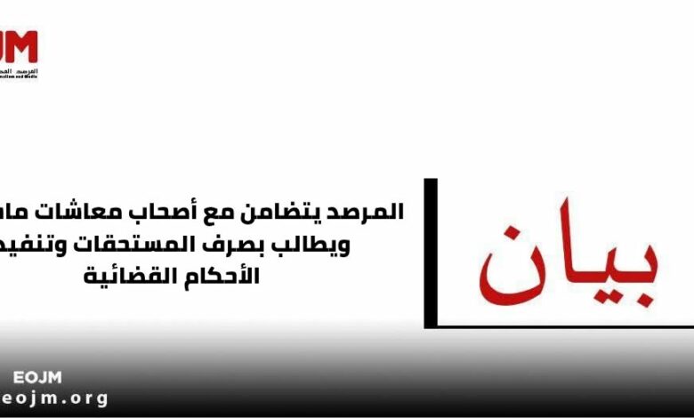 ويشدد المرصد على أن المستحقات المالية للمحالين إلى المعاش ليست منحة ولا تفضّلًا إداريًا، بل استحقاق قانوني واجب السداد، وأن استمرار تعطيلها أو الانتقاص منها يمثل انتهاكًا لا يجوز تطبيعه أو تمريره تحت أي مبرر. ويجدد المرصد دعوته إلى إنهاء هذا الملف بصورة عادلة وحاسمة تضمن صرف المستحقات كاملة وتنفيذ الأحكام دون تأخير، بما يصون كرامة العاملين السابقين في الإعلام الرسمي وحقوقهم.