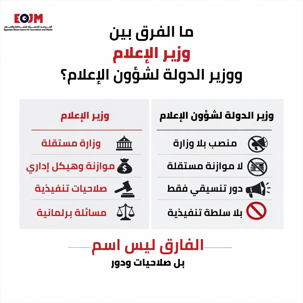 الفارق بين المنصبين، في جوهره، ليس فارقًا في التسمية، بل اختلاف بنيوي في الصلاحيات والدور. فوزير الإعلام كان فاعلًا تنفيذيًا يمتلك أدوات الإدارة والتنفيذ، بينما يؤدي وزير الدولة لشؤون الإعلام دورًا تنسيقيًا محكومًا بإطار التفويض الحكومي وحدوده، دون امتلاك سلطة تنفيذية مستقلة على أرض الواقع، وهو تمييز ضروري لفهم طبيعة إدارة الإعلام في مصر اليوم وضبط سقف التوقعات العامة بشأن هذا المنصب.