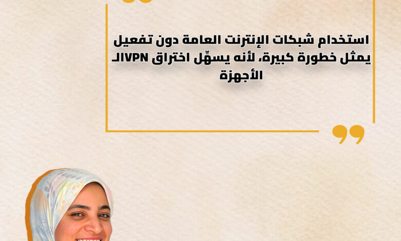 استخدام شبكات الإنترنت العامة دون تفعيل الـVPN يمثل خطورة كبيرة، لأنه يسهِّل اختراق الأجهزة. وفي حال الاضطرار إلى استخدام شبكة خارجية، يجب اختيار برنامج VPN مناسب للجهاز وللدولة، فهو يحجب وصول أي جهة إلى البيانات أو الحسابات التي يتم تصفحها.