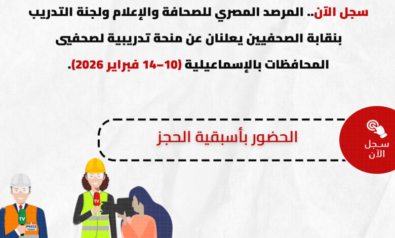 تُعقد الدورة التدريبية خلال الفترة من 10 فبراير حتى 14 فبراير 2026، وذلك في مركز التعليم المدني بمحافظة الإسماعيلية، وتتضمن محاور تطبيقية في: التحرير الصحفي، صحافة الموبايل، وتحسين جودة المحتوى بالذكاء الاصطناعي.