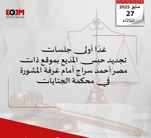 تنظر غدًا الثلاثاء الموافق ٢٧ مايو ٢٠٢٥ الدائرة الثانية إرهاب في محكمة جنايات القاهرة بمأمورية استئناف القاهرة في مركز إصلاح وتأهيل مدينة بدر أولى جلسات تجديد حبس الصحفي أحمد سراج امام غرفة المشورة -بعد انتهاء المدة القانونية المحددة لنظر التجديد امام النيابة -في القضية رقم ٧ لسنة ٢٠٢٥ حصر أمن دولة عليا، ويواجه “سراج” اتهامات الانضمام إلى جماعة ارهابية ونشر أخبار وبيانات كاذبة وارتكاب جريمة من جرائم التمويل، واستخدام موقع ذات مصر في ارتكاب جريمة نشر الأخبار الكاذبة.