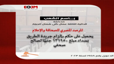 أكتوبر 20, 2025المرصد المصري للصحافة والإعلام يحصل على حكم بإلزام جريدة الطريق بسداد مبلغ 131950 جنيها لصالح صحفي