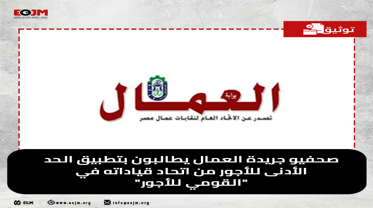 وثق المرصد المصري للصحافة والإعلام، الأحد 7 ديسمبر 2025، واقعة تقدم صحفيون في جريدة العمال، الصادرة عن الاتحاد العام لنقابات عمال مصر، بشكوى إلى مجلس الوزراء، ووزارة العمل، ونقابة الصحفيين، للمطالبة بتطبيق الحد الأدنى للأجور عليهم.